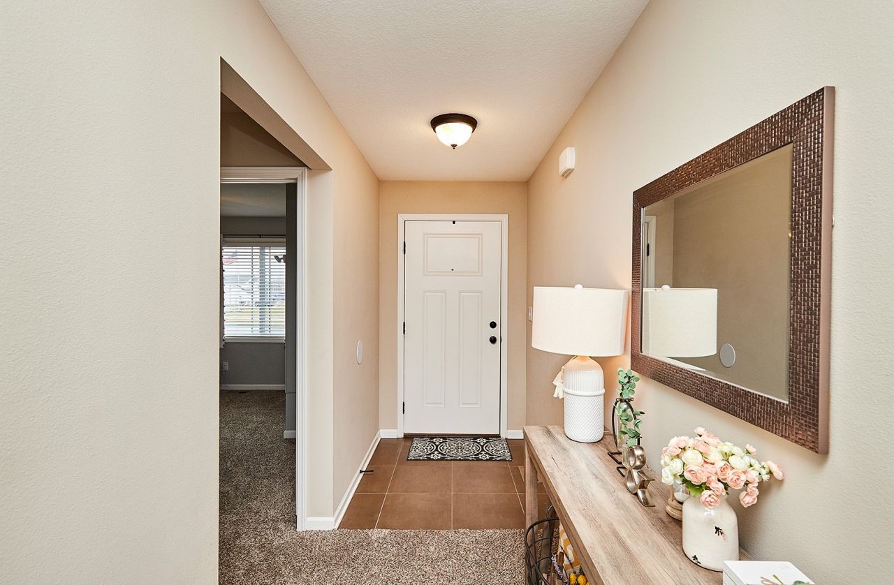 The split-bedroom floor plan offers two front bedrooms that share a full bath with quartz counters and tile flooring. The private primary suite is located at the rear of the home and includes a dual quartz vanity en suite and a large walk-in closet.